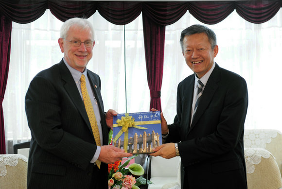 Executive Deputy Secretary and Vice President Chen Chunsheng exchanging gifts with Vice Chancellor Richard McCarty