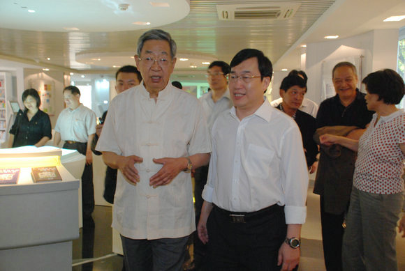 On October 20, with the company of Li Zhujiang, Deputy Secretary-General of the Provincial People's Congress Standing Committee, Xu Jialu, vice chairman of the 10th National People's Congress Standing Committee and president of the World Chinese Language Teaching Society and Xu Lin, the State Department counselor, director of Hanban, secretary general of the Confucius Institute Headquarters, inspected SYSU Base for International Chinese Teaching Materials Developing and Teacher Training (hereinafter referred to as the "base"). SYSU President Xu Ningsheng, former leader and bases Council president Huang Daren, and deputy party committee secretary Liang Qingyin received vice chairman Xu Jialu and his delegation.