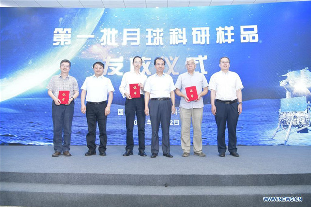 Photo taken on July 12, 2021 shows the ceremony of delivering the first batch of lunar samples to research institutions in Beijing, capital of China. China on Monday delivered about 17 grams of lunar samples brought back by the Chang'e-5 probe to 13 institutions, which had applied for research programs to the Lunar Exploration and Space Program Center of the China National Space Administration. (Photo by Zhang Gaoxiang/Xinhua)