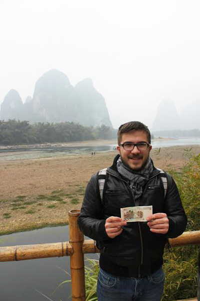 René in Guilin in front of the karst landscape that inspired design on the twenty RMB note (Photo provided by René)
