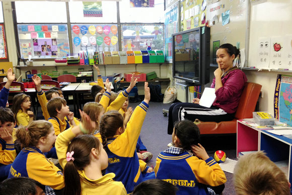 Luo Chaoning taught second grade pupils body parts in Chinese class at Australia Melbourne Serpell Primary School