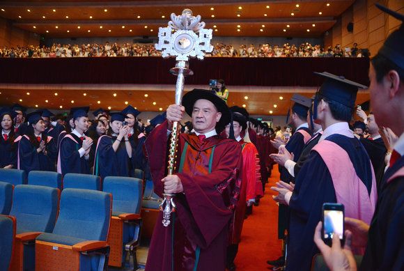 A respected senior professor held the scepter of Sun Yat-sen University and led the officiating professors into K. K. Leung Hall.