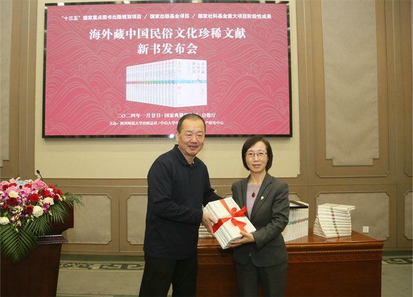 The book series Chinese Folklore Documents Overseas is donated to the National Library of China in Beijing on Jan 20.[Photo provided to China Daily]