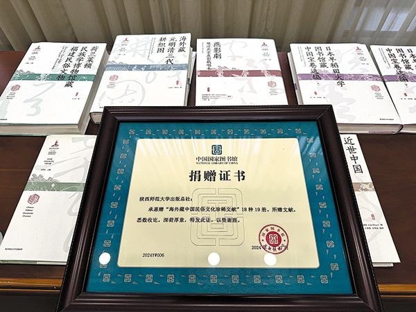 A certificate of the books' donation issued by the National Library of China to the publisher, Shaanxi Normal University General Publishing House.[Photo provided to China Daily]