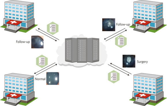 Liu and co-authors' consistent results across such a battery of simulated and real-world tests should help the eventual implementation of machine learning in the clinic. Towards this goal, the authors integrated the CNN algorithm with a web-based user interface and with cloud computing to help improve the management of CC patients in isolated, non-specialized hospitals. In such a collaborating platform, a registered user can upload the ocular images from a remote site, let the AI software assist with diagnoses and treatment plans, and then check with expert ophthalmologists in a collaborating hospital when necessary (Fig. 1). Importantly, such a platform would facilitate the collection of bigger sets of CC images for further training of the CNNs. This is particularly necessary for rare diseases, as their low prevalence makes it hard for researchers to recruit enough patients to conduct data-driven analyses.