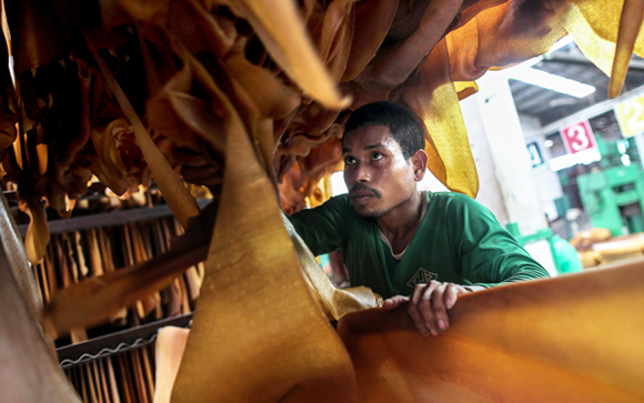 A worker removes smoked rubber sheets from a rack to be trimmed at the Thai Hua Rubber Pcl factory in Samnuktong, Rayong province, Thailand. [Photo / Agencies]