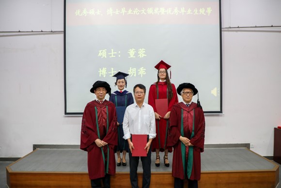Professor Fan Changxi announced the university’s decision of conferring master’s and doctoral degrees. Professor Peng Yuping presented the degree certificates and took photos with the graduates.