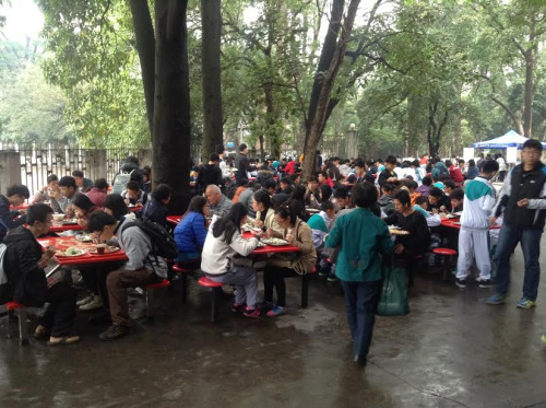 Eating outside Xue Yi Cafeteria on campus