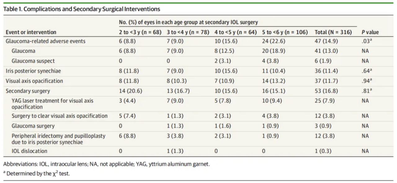 However, the incidence of glaucoma-related adverse events increased with the age at surgery, rising from 8.8% in the 2-3-year-old group to 22.6% in the 5-6-year-old group. This finding underscores the potential risk of increased glaucoma incidence with delayed IOL implantation, highlighting the need for clinical vigilance.