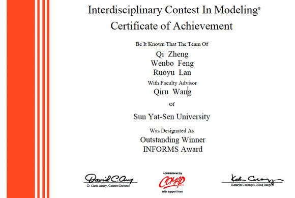 SYSU students gain the highest award in 2016 Mathematical Contest in Modeling
