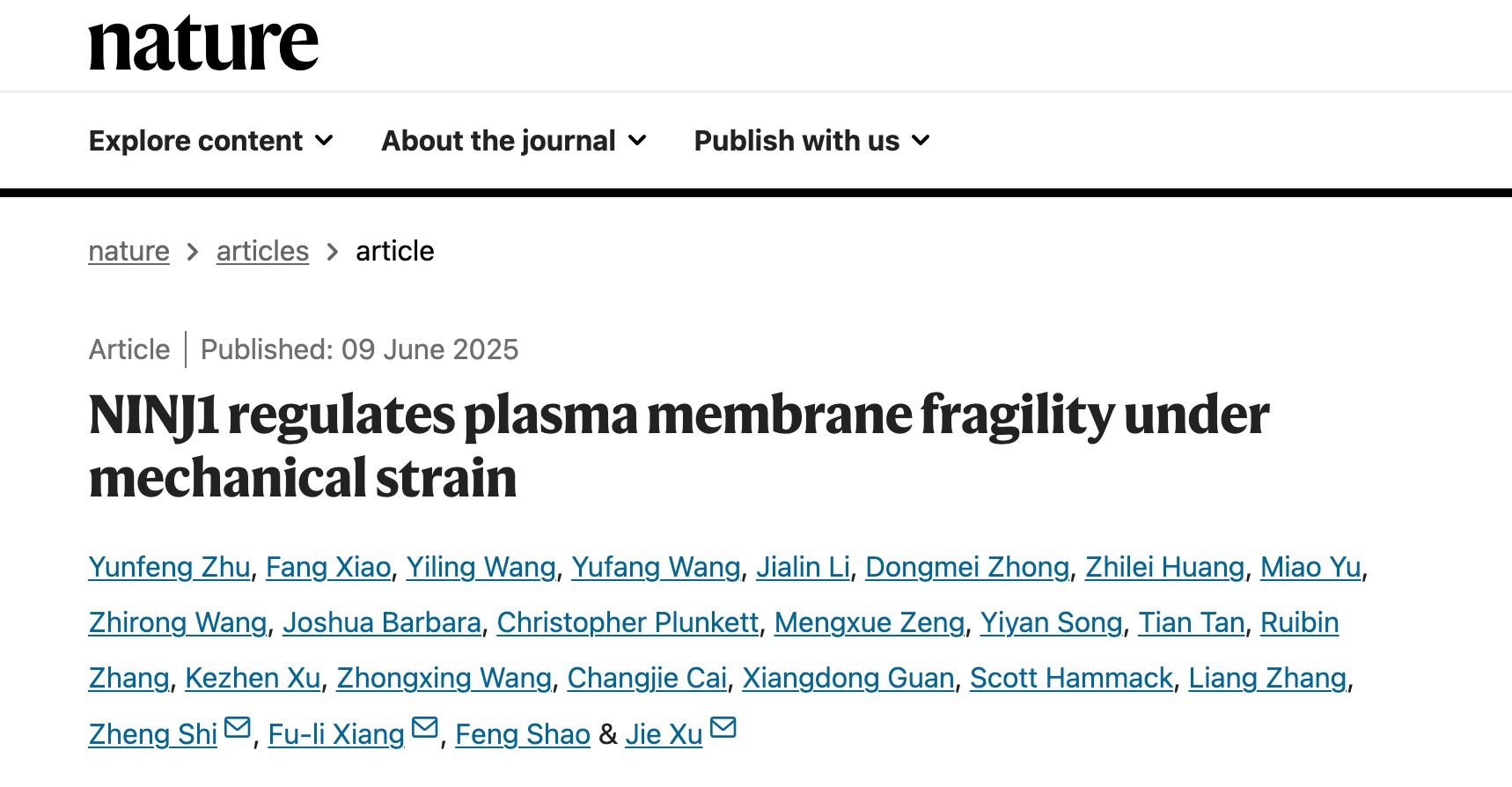 The research team led by Jie Xu, a researcher from the First Affiliated Hospital of Sun Yat-sen University published an article titled “NINJ1 regulates plasma membrane fragility under mechanical strain” in Nature on June 9. In collaboration with researchers from Rutgers University, the team developed the world's first high-throughput mechanical tension stimulation system and employed it to id...
