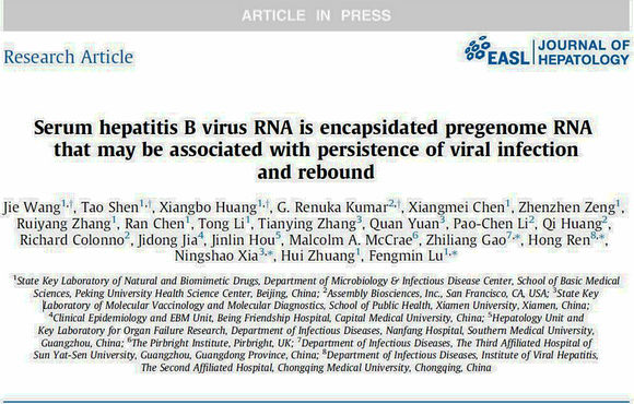 This study, entitled “Serum hepatitis B virus RNA is encapsidated pregenome RNA that may be associated with persistence of viral infection and rebound”, was published online on May 28th 2016 in