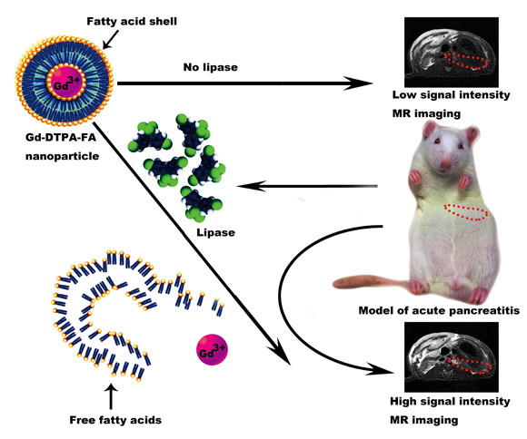 For the above scientific problems, Professor Deng Yubin’s team adopted the strategy of lipase enzyme activation and synthesized a conditionally activated, gadolinium-containing, nanoparticle-based MRI nanoprobe (Gd-DTPA-FA) as a diagnostic tool for the early identification of AP, which exhibited low cytotoxicity and excellent biocompatibility in vitro and in vivo studies. L-arginine induced a gradual increase in the intensity of the T1-weighted MRI signal from 1h to 36h in AP rat models. The increase in signal intensity was most significant at 1h, 6h and 12h. These results suggest that the Gd-DTPA-FA as a MRI contrast agent is highly efficient and specific to detect early AP.