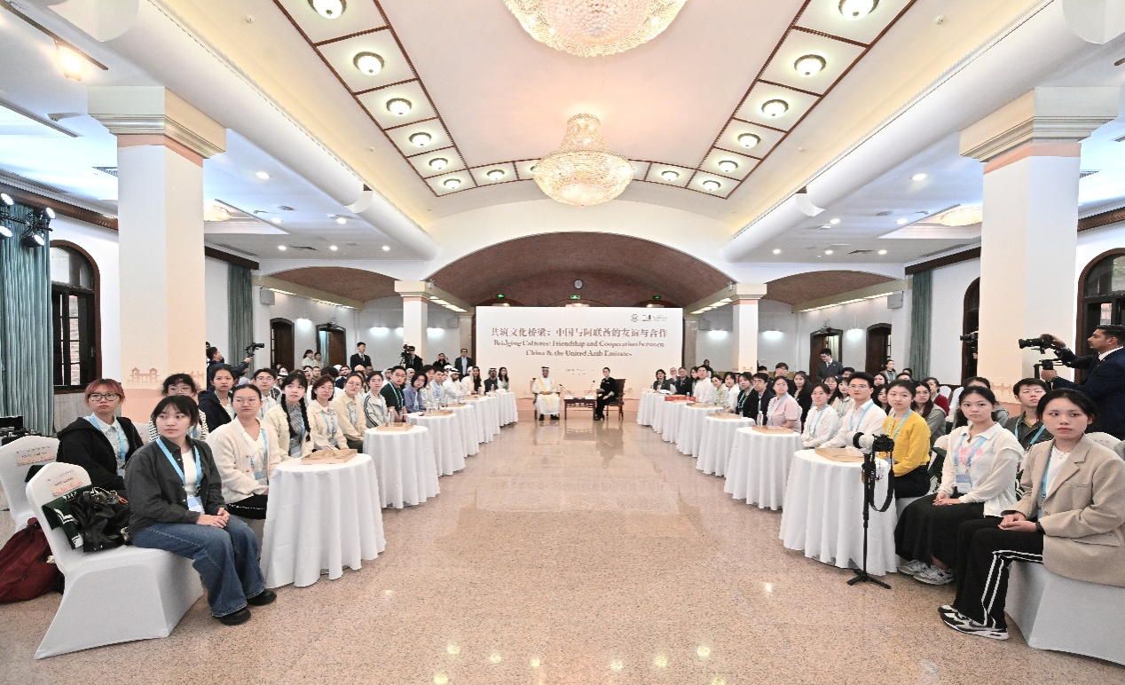 Sheikh Saud later joined students and teachers to exchange views on China-UAE friendship at a sharing session themed on “Bridging Cultures: Friendship and Cooperation between China & the United Arab Emirates.” He shared his unique perspectives on global cooperation and cultural exchange with student representatives.