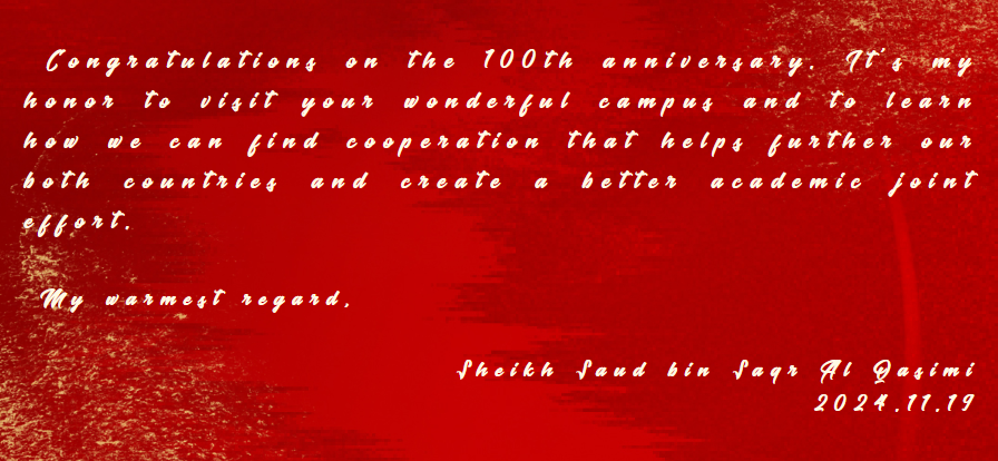 “Congratulations on the 100th anniversary,” Sheikh Saud wrote in his congratulatory letter. “It’s my honor to visit your wonderful campus and to learn how we can find cooperation that helps further our both countries and create a better academic joint effort.”